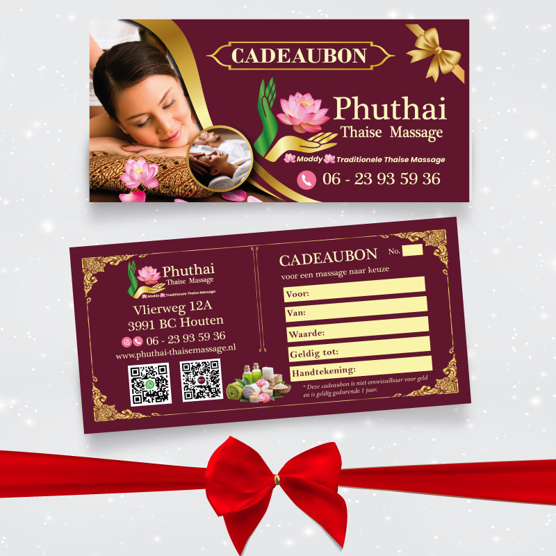 Trakteer een goede vriend(in), een familielid of gewoon uzelf (met partner) op een heerlijke massage bij Phuthai Thaise Massage. We hebben altijd cadeaubonnen op voorraad liggen in onze salon op Houten.
